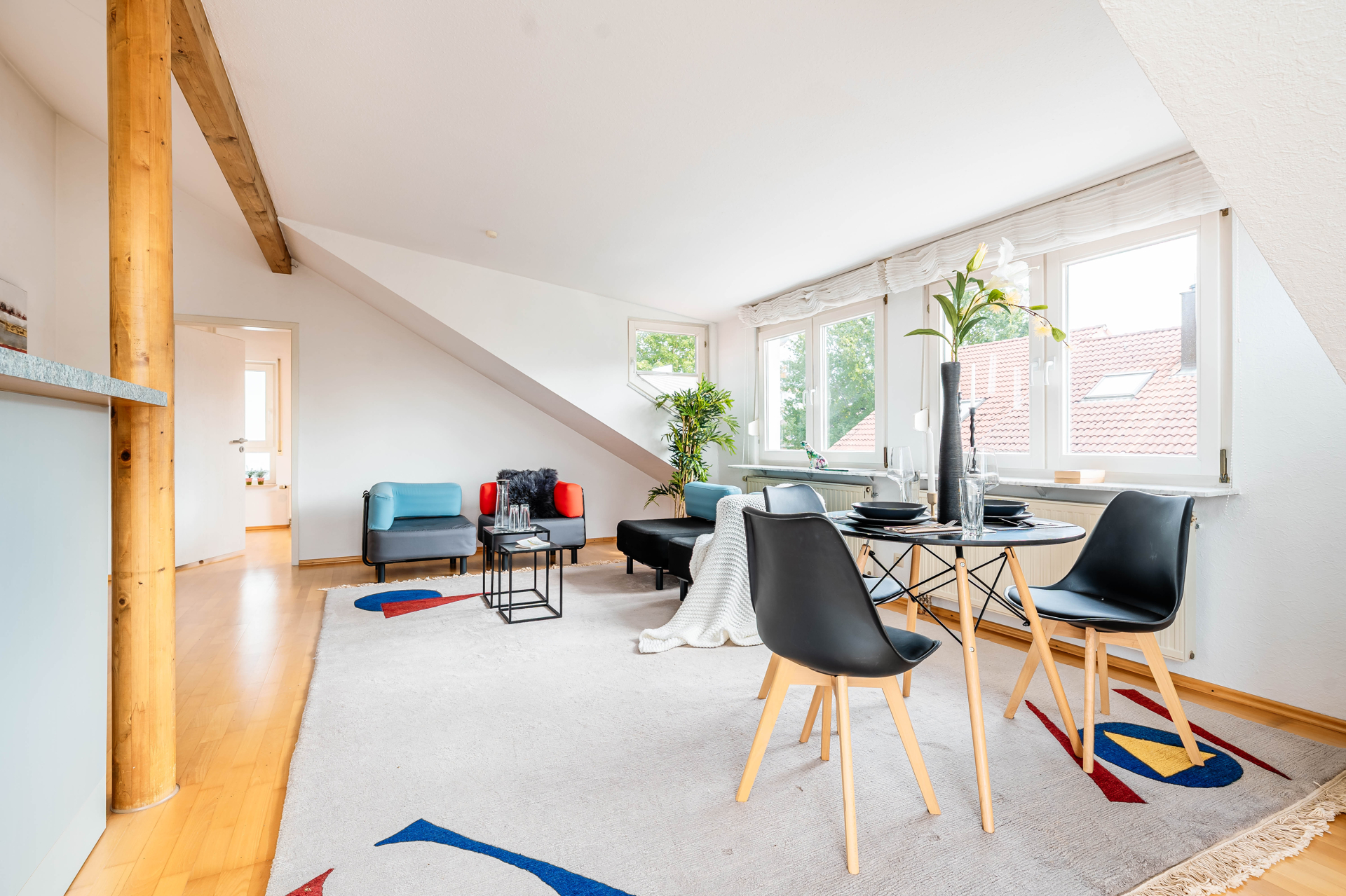 Diese besondere Immobilie befindet sich im Dachgeschoss eines Dreifamilienhaus in zweiter Reihe am Rande einer gewachsenen und ruhigen Wohngegend.