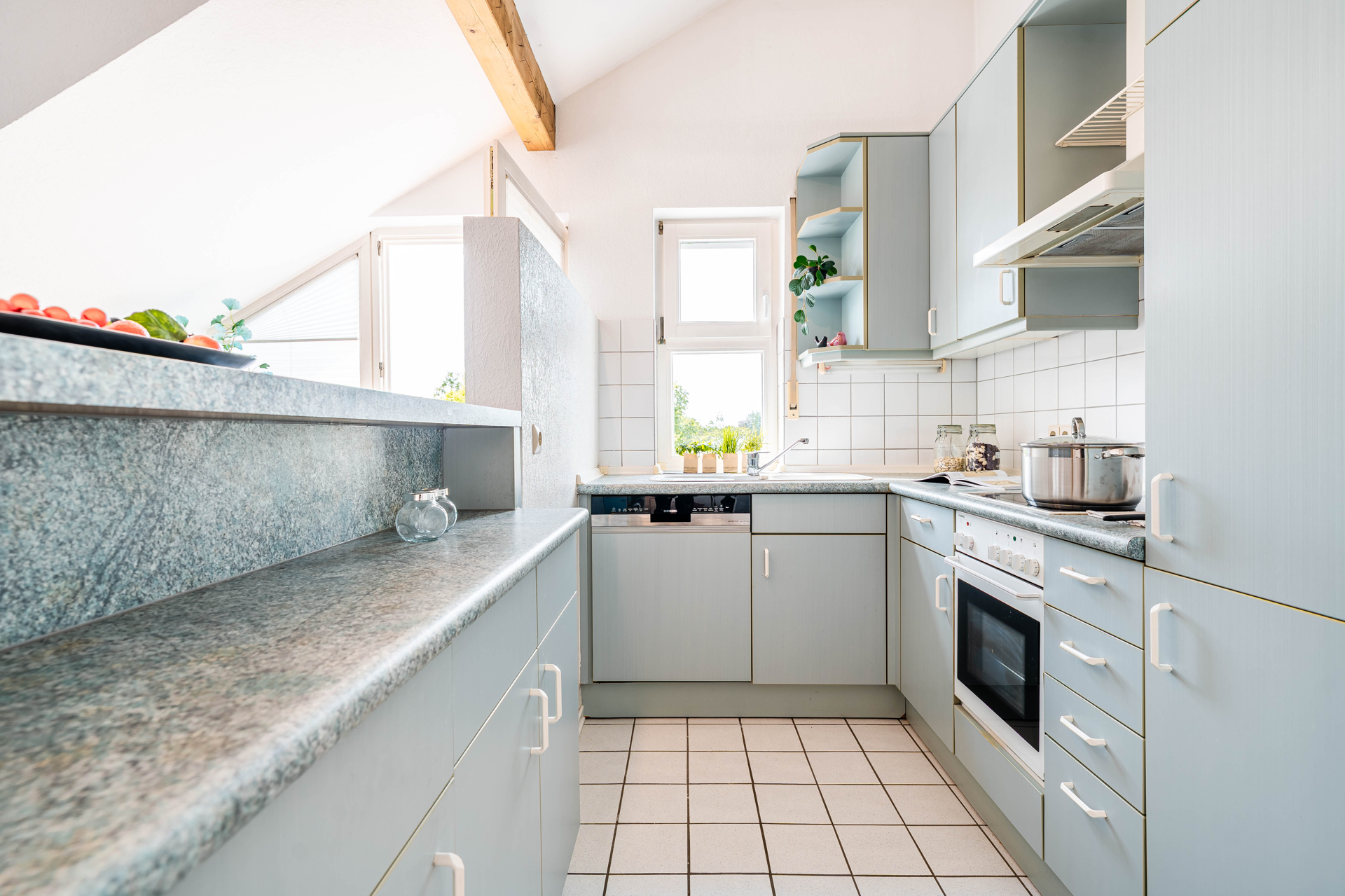 Das Herzstück der Wohnung ist zweifelsohne der großzügige Wohn- und Essbereich mit integrierter offener Einbauküche. Die Dachgaube gibt diesem Raum besonders viel Volumen und trägt einen großen Teil zu dem Panorama ähnlichen Eindruck bei. Dieser Bereich wird durch einen Balkon in West-Ausrichtung vervollständigt, welcher Ihnen traumhafte Anblicke verschafft.